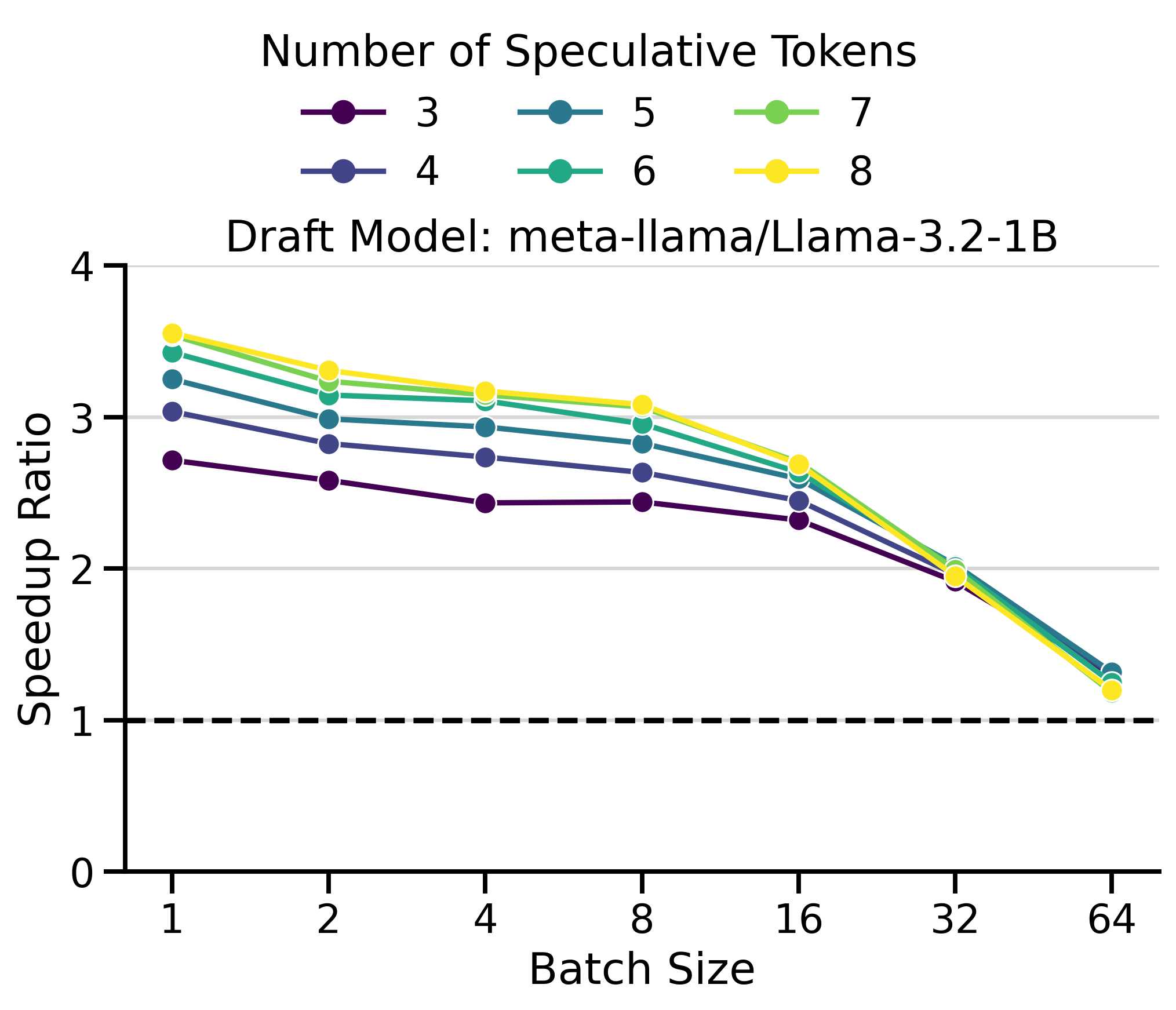 EAGLE-3 is a modern speculative decoding technique supported by vLLM that uses lightweight draft models trained specifically for speculative decoding. The EAGLE-3 paper by Li et al. (2025) reports speedup ratios on SGLang11 between 1.38× and 1.82× at batch sizes ranging from 2 to 64 (table 3), and slightly lower speedups on vLLM (table 5).