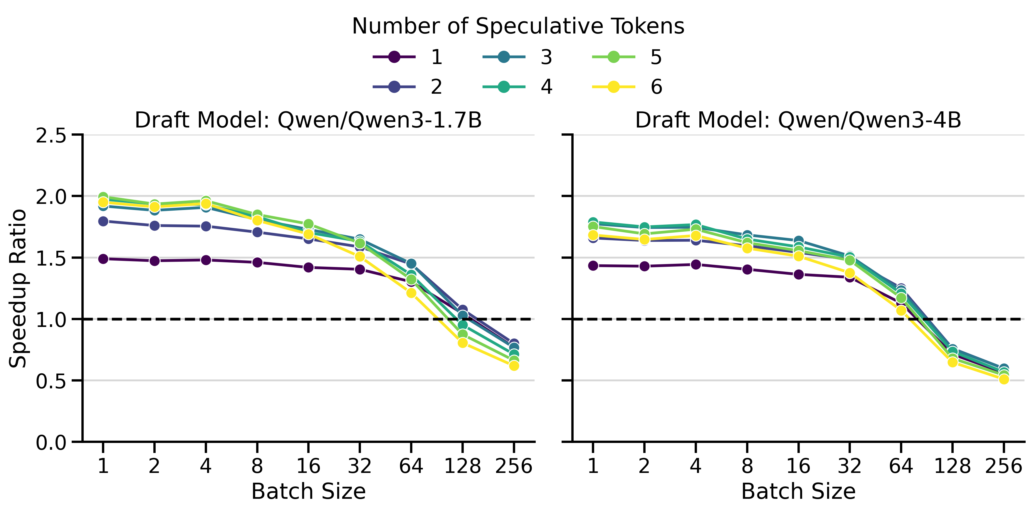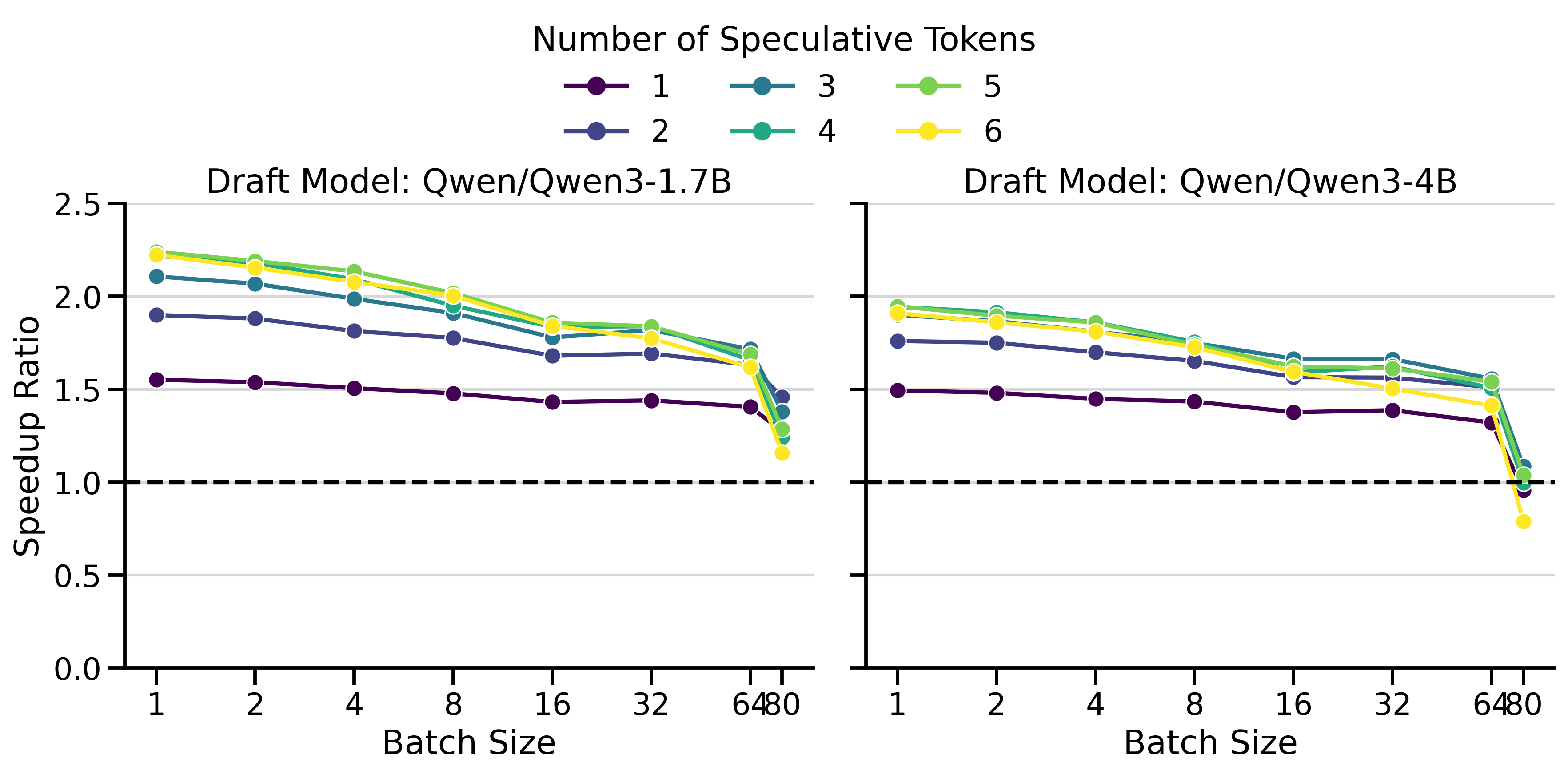 Draft Model Size Trade-off: The smaller 1.7B draft model achieves higher speedups than the 4B, despite the 4B having better acceptance rates (Figure 5). The 4B’s slower inference limits its overall speedup.