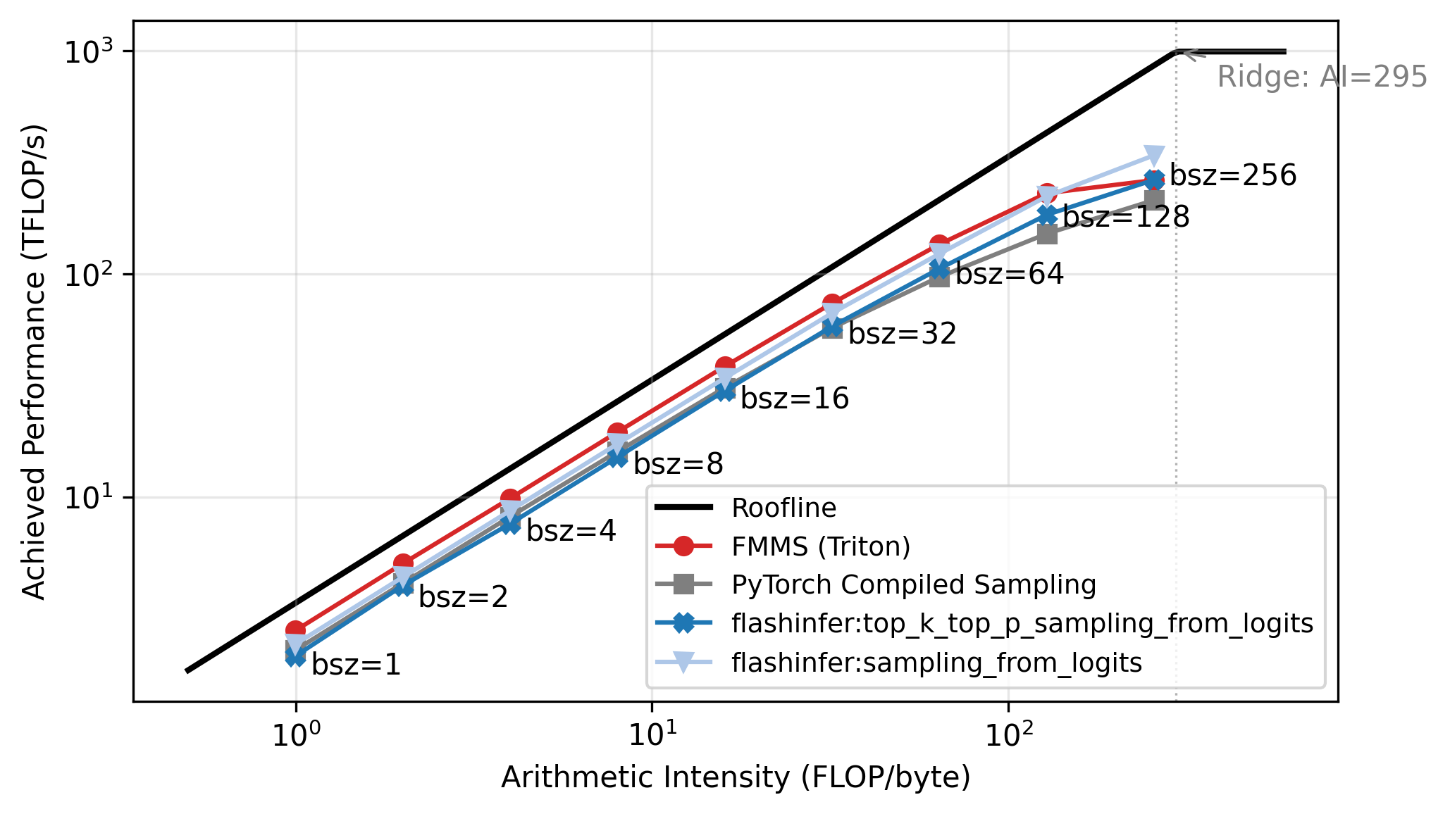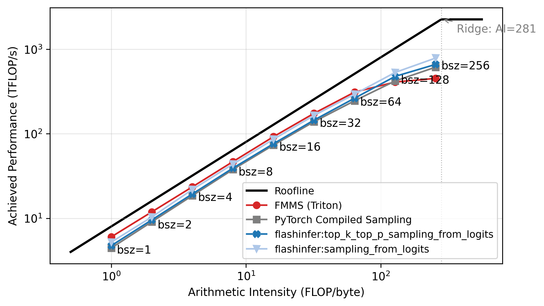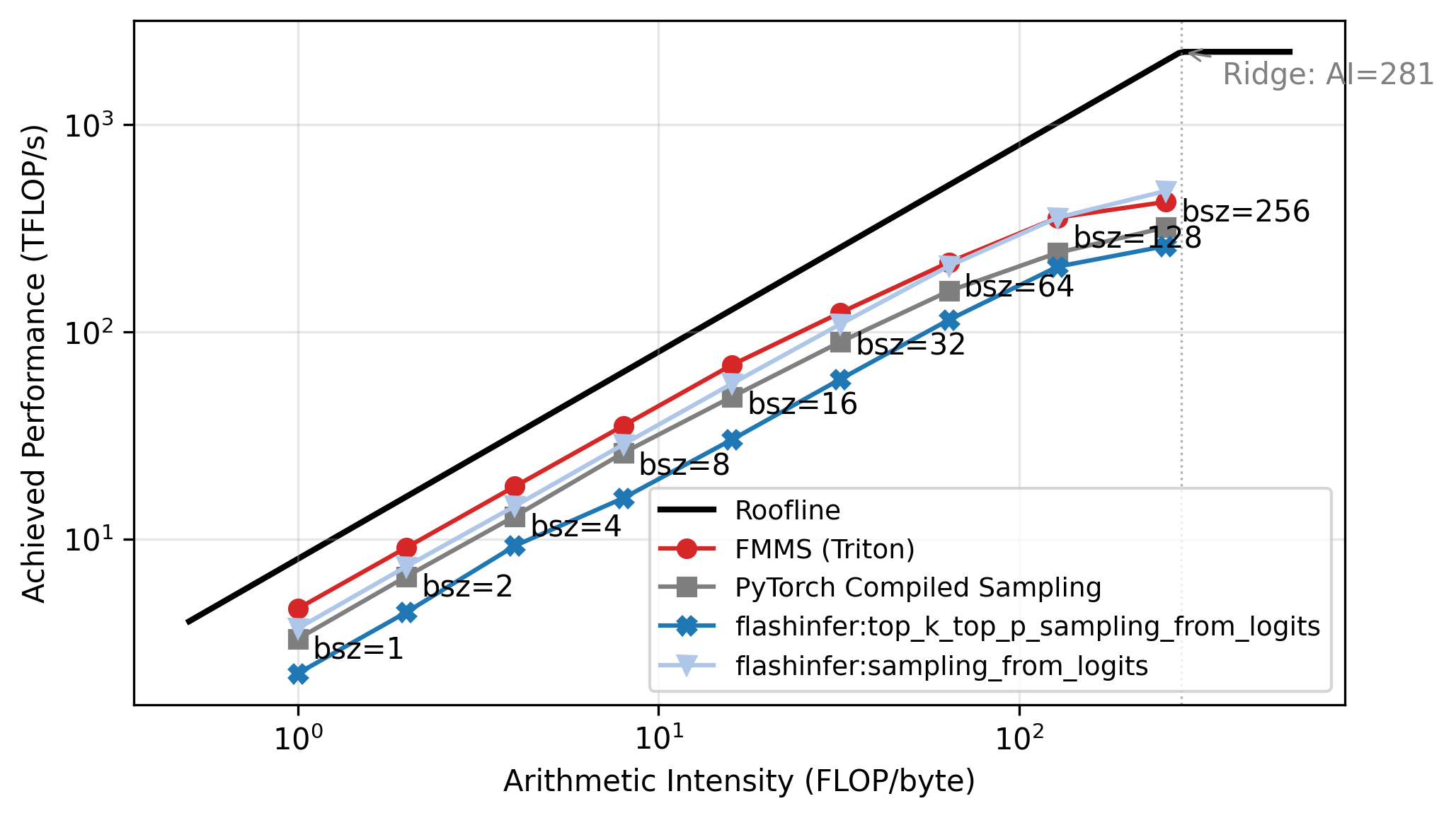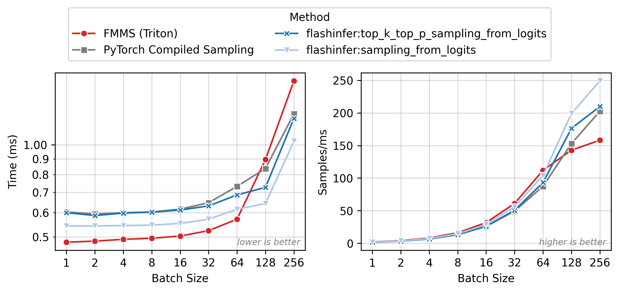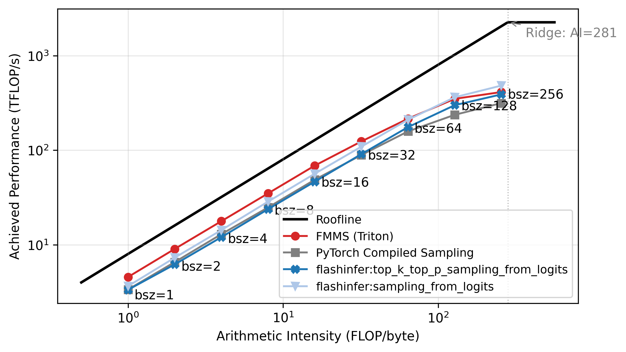 Both FlashInfer kernels require the full logits, so their runtimes include the matmul that computes the logits. This is a fair comparison because FMMS also computes a matmul, the full logits tensor is just not written to GMEM.