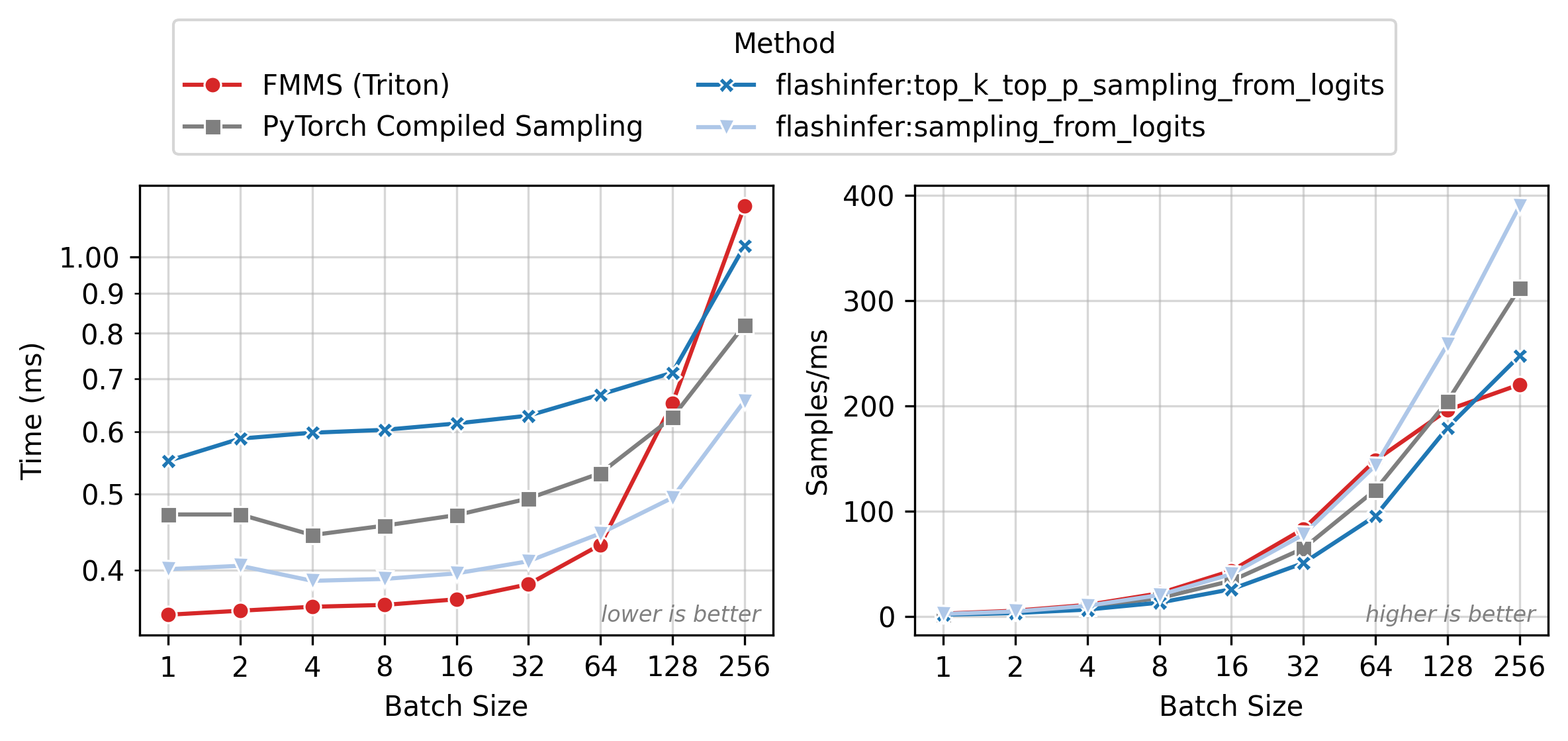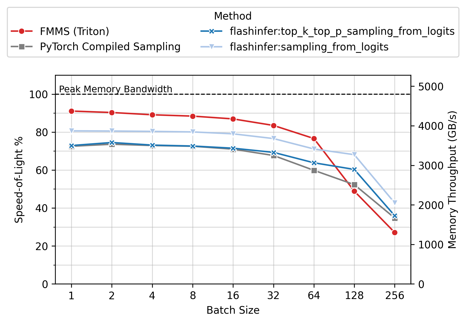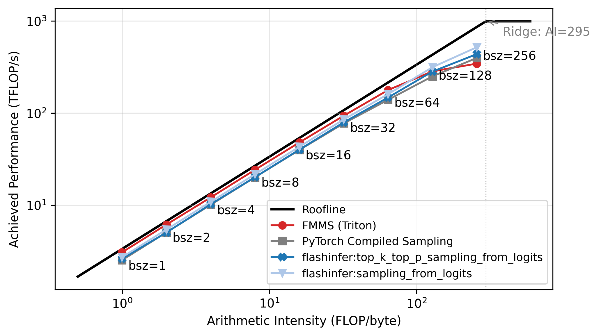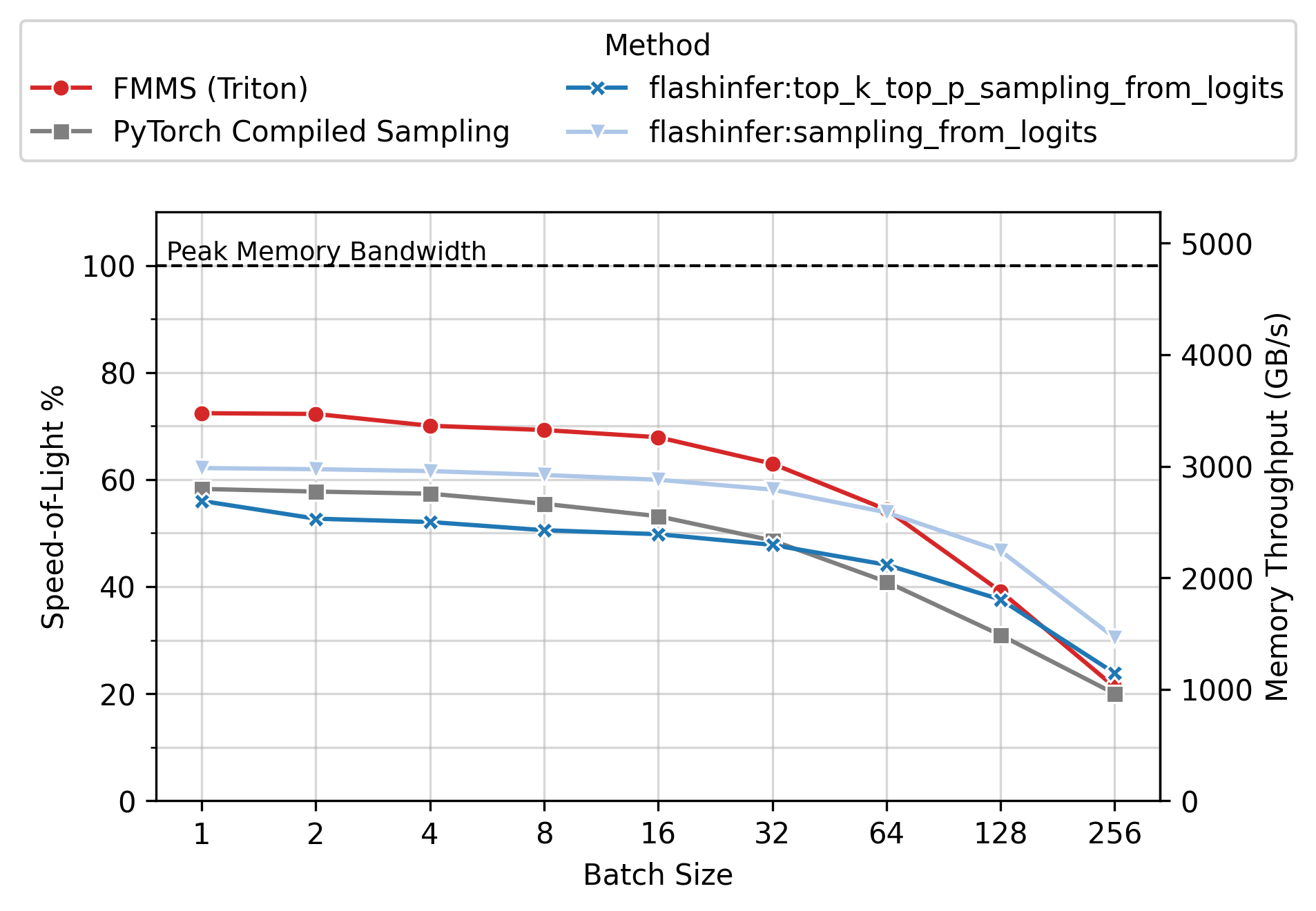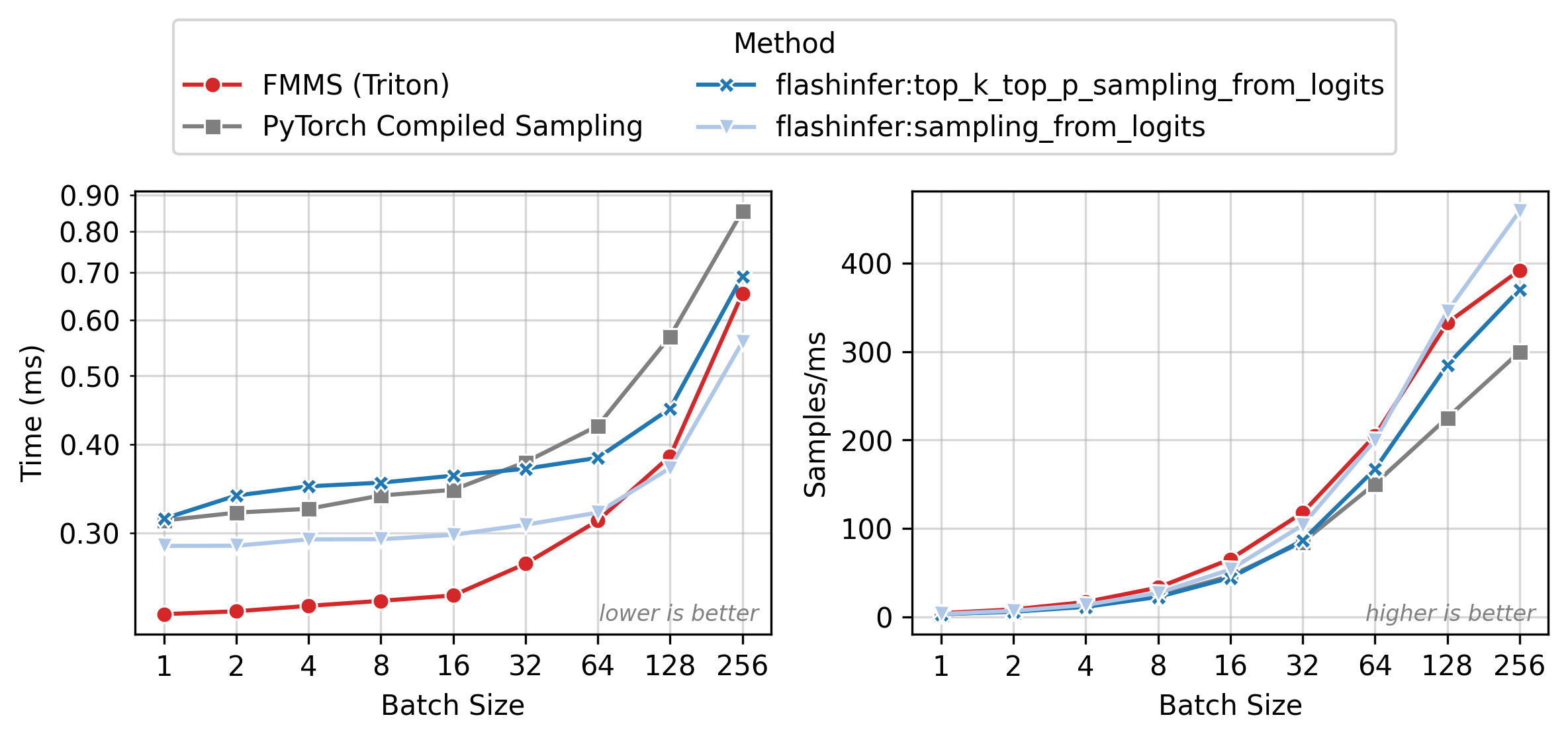 Both FlashInfer kernels require the full logits, so their runtimes include the matmul that computes the logits. This is a fair comparison because FMMS also computes a matmul, the full logits tensor is just not written to GMEM.