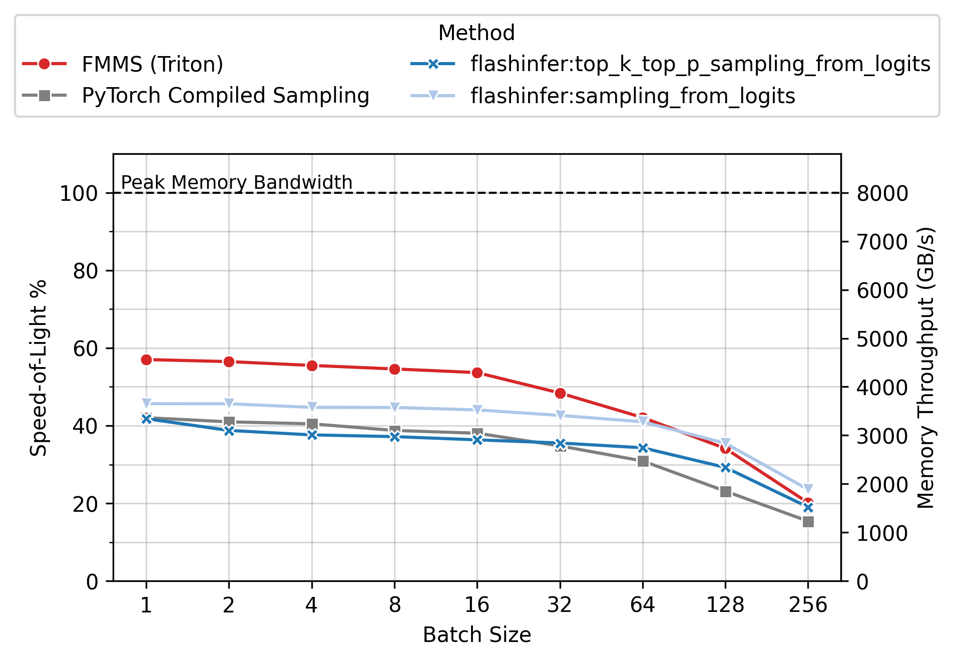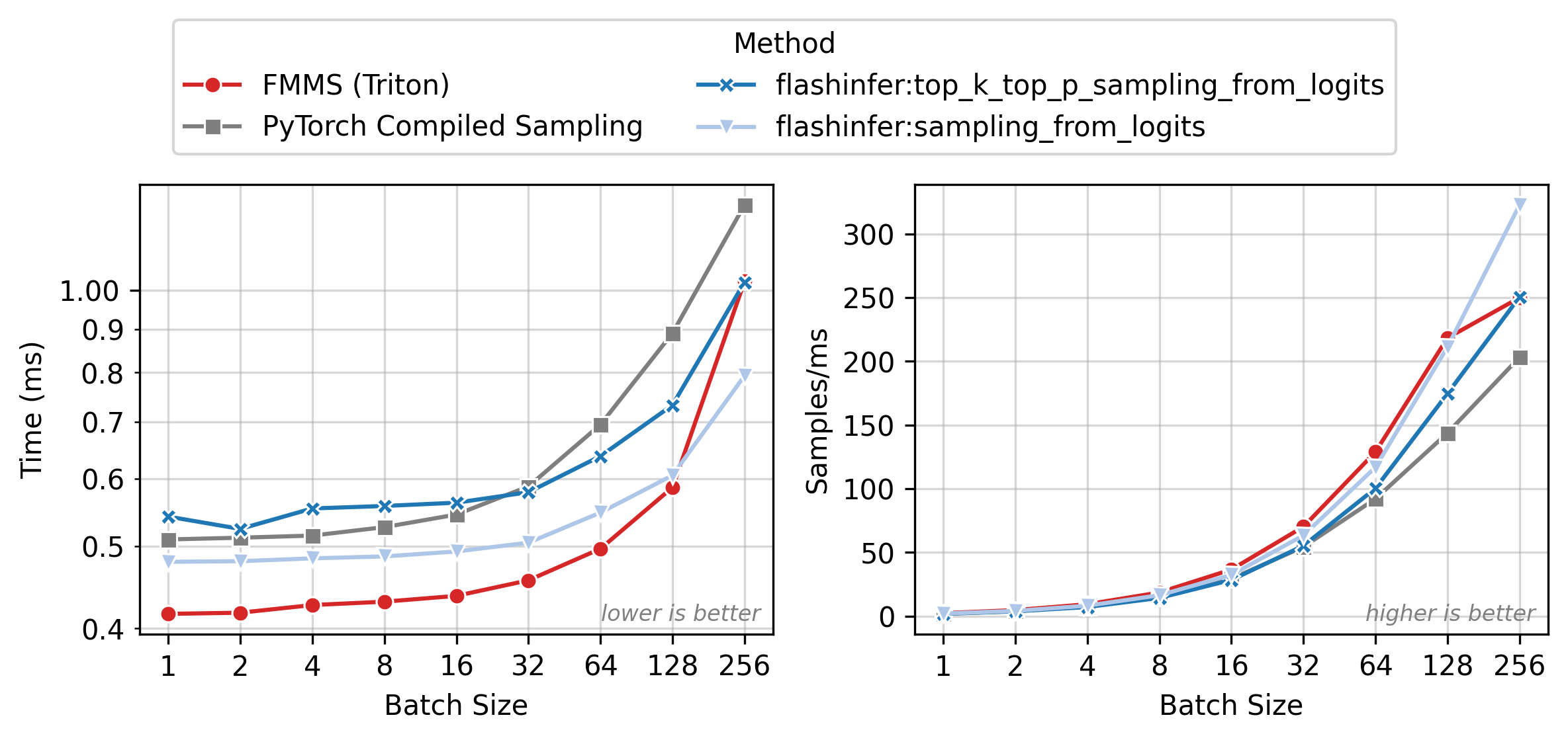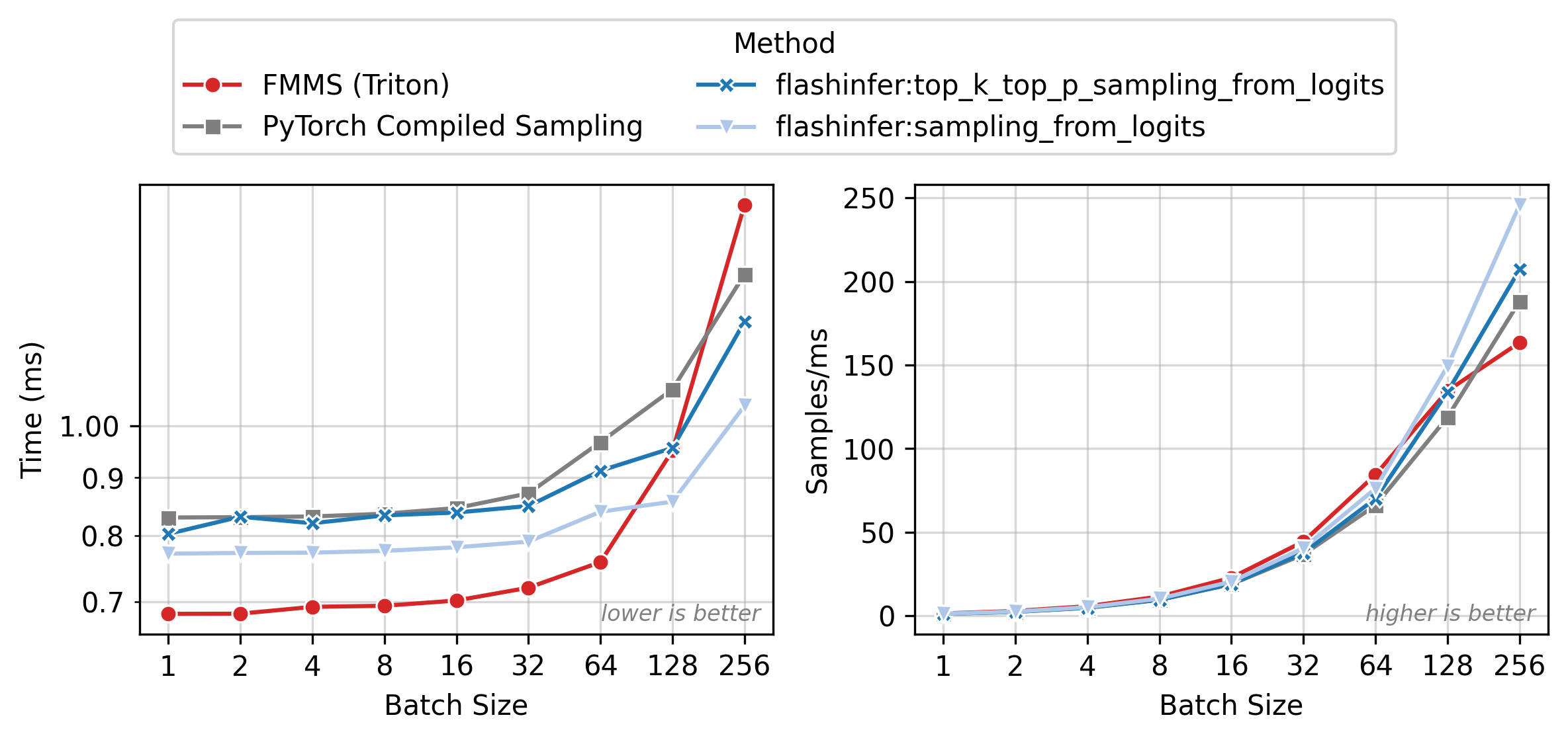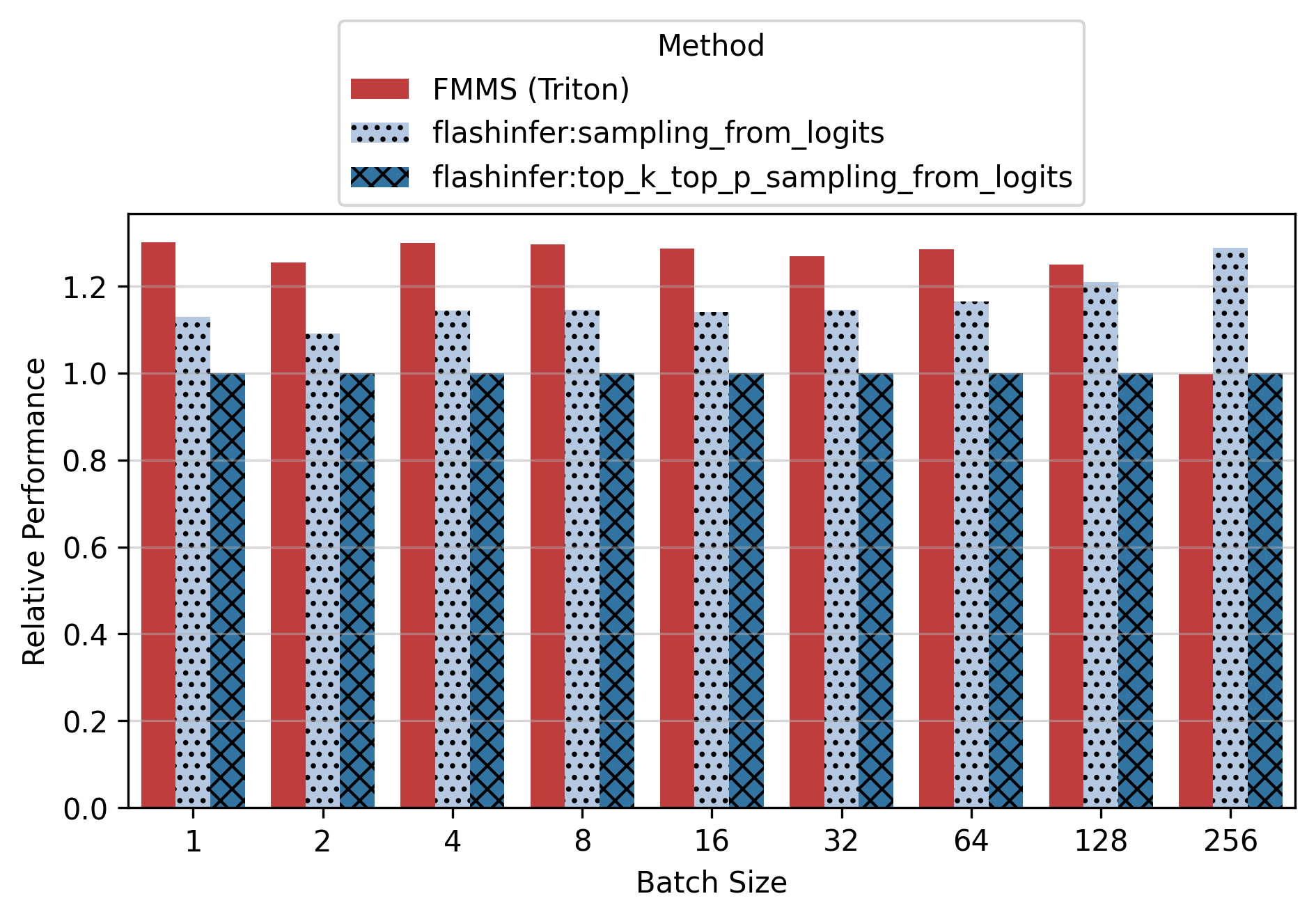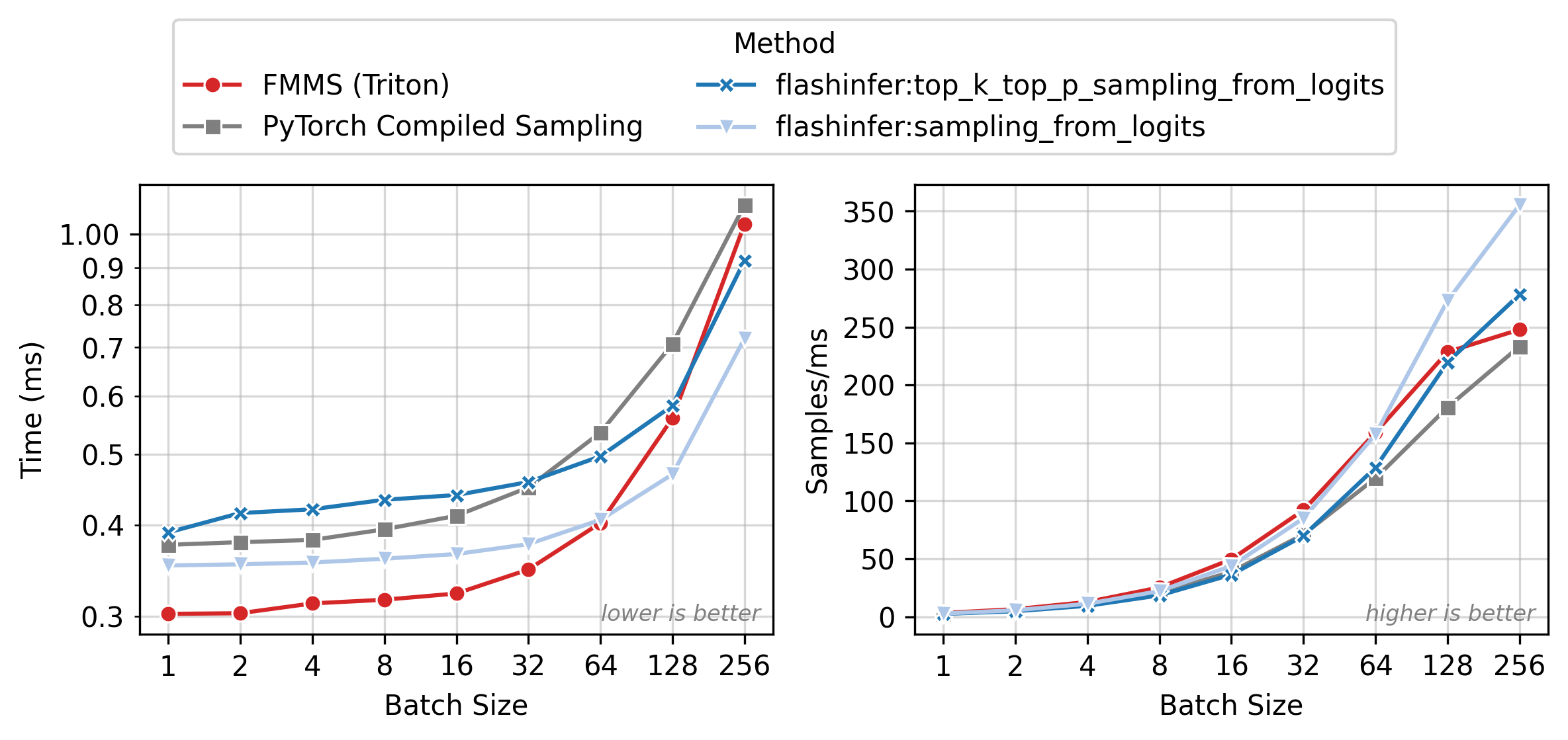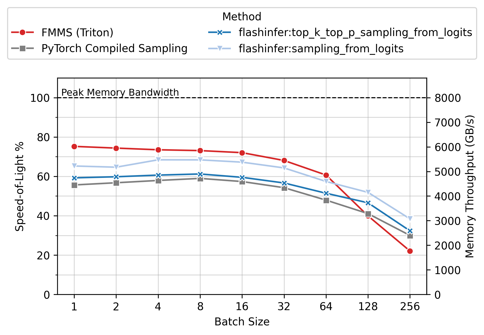 Both FlashInfer kernels require the full logits, so their runtimes include the matmul that computes the logits. This is a fair comparison because FMMS also computes a matmul, the full logits tensor is just not written to GMEM.