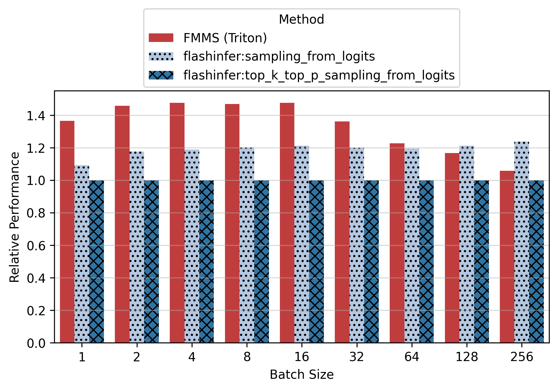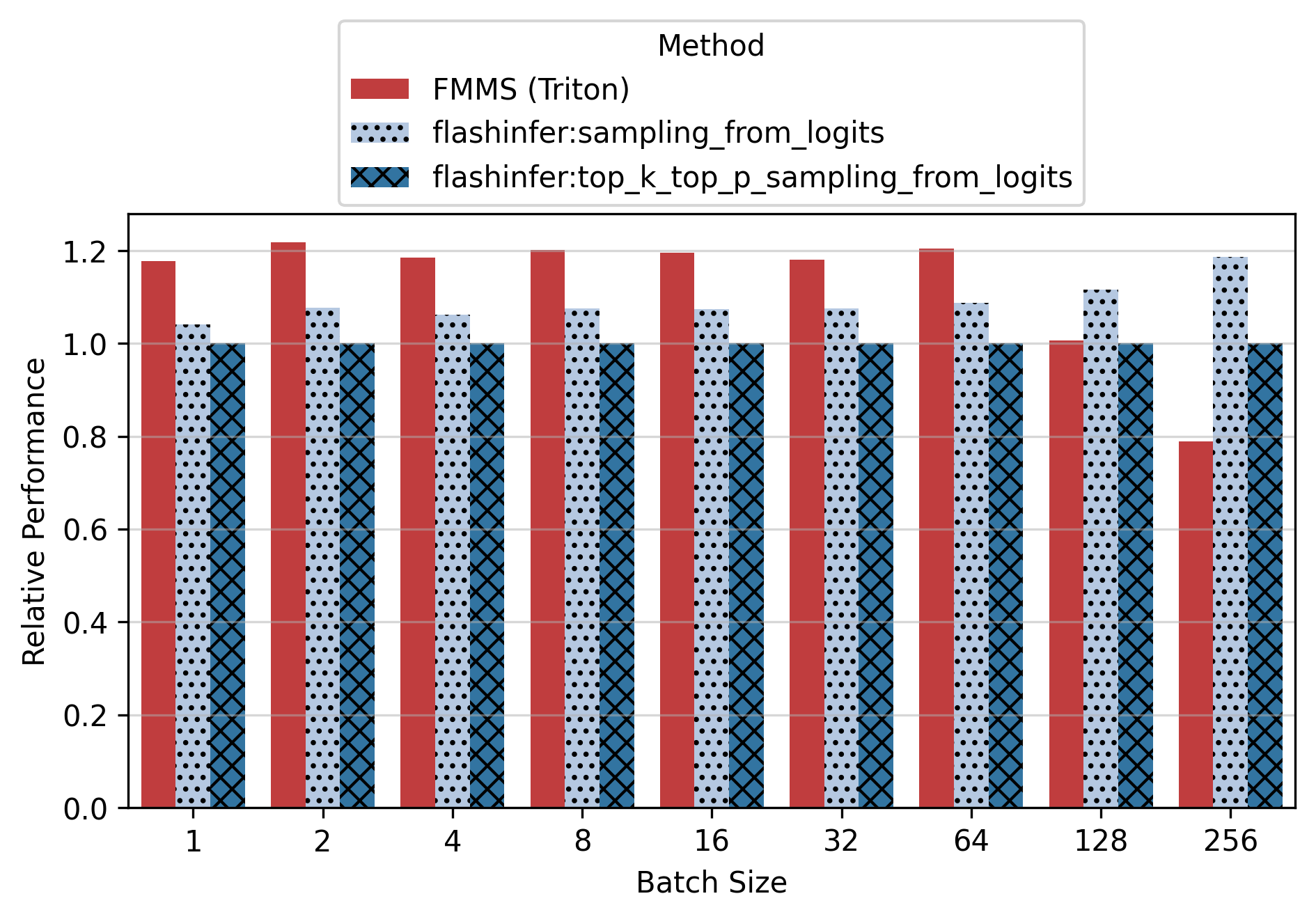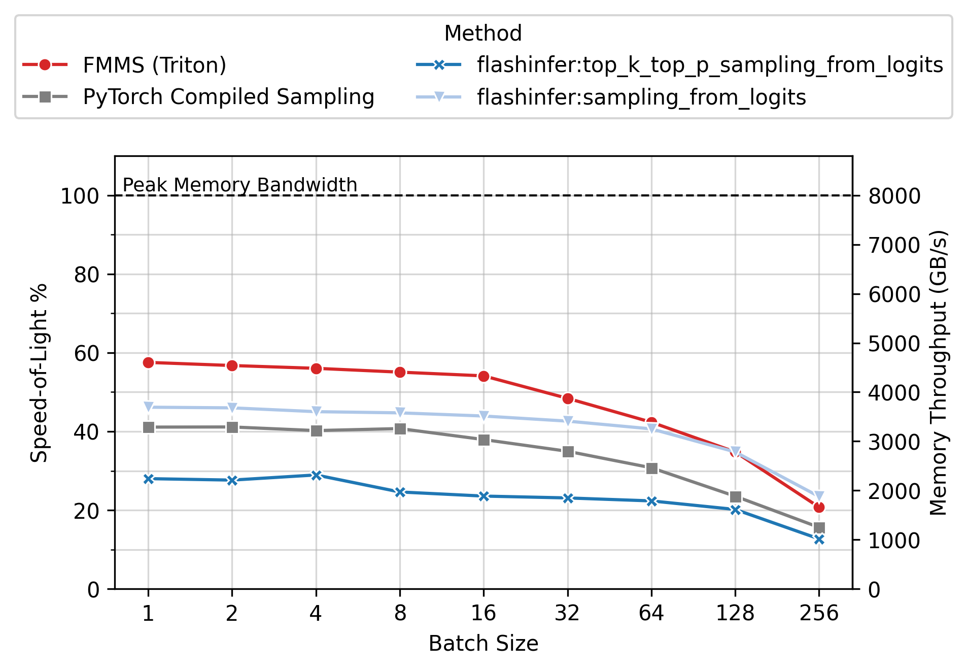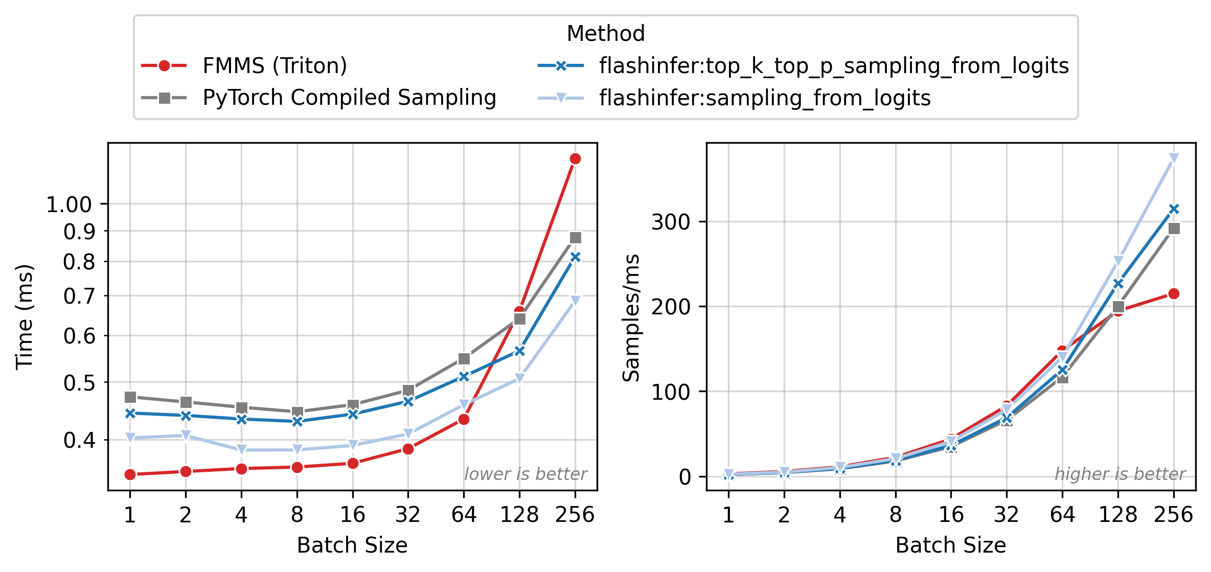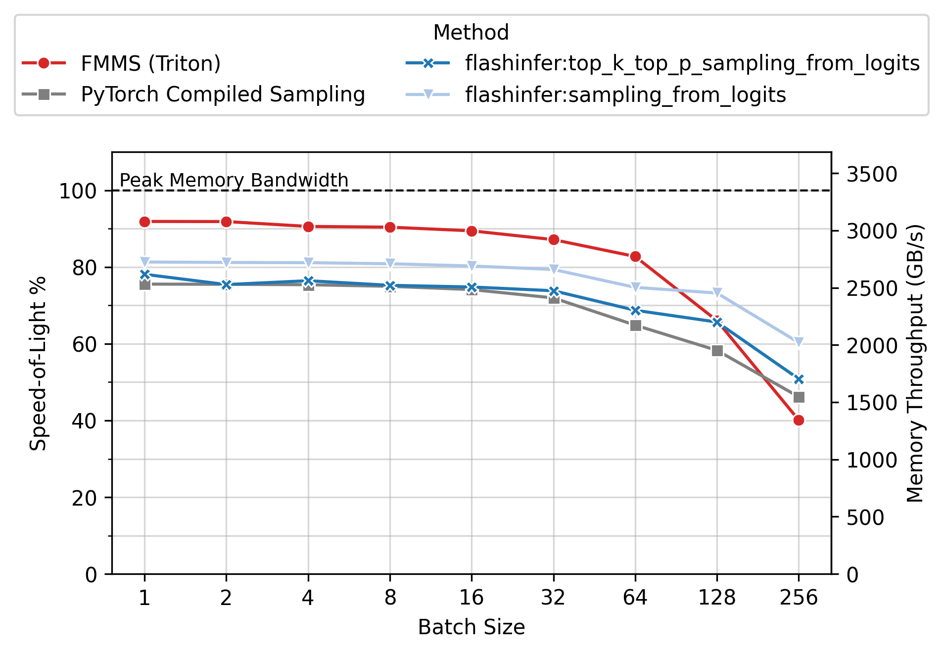 Both FlashInfer kernels require the full logits, so their runtimes include the matmul that computes the logits. This is a fair comparison because FMMS also computes a matmul, the full logits tensor is just not written to GMEM.