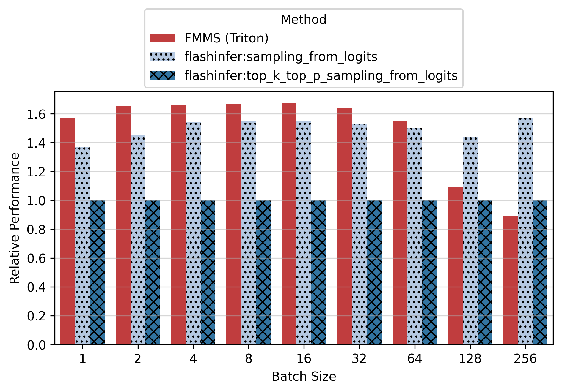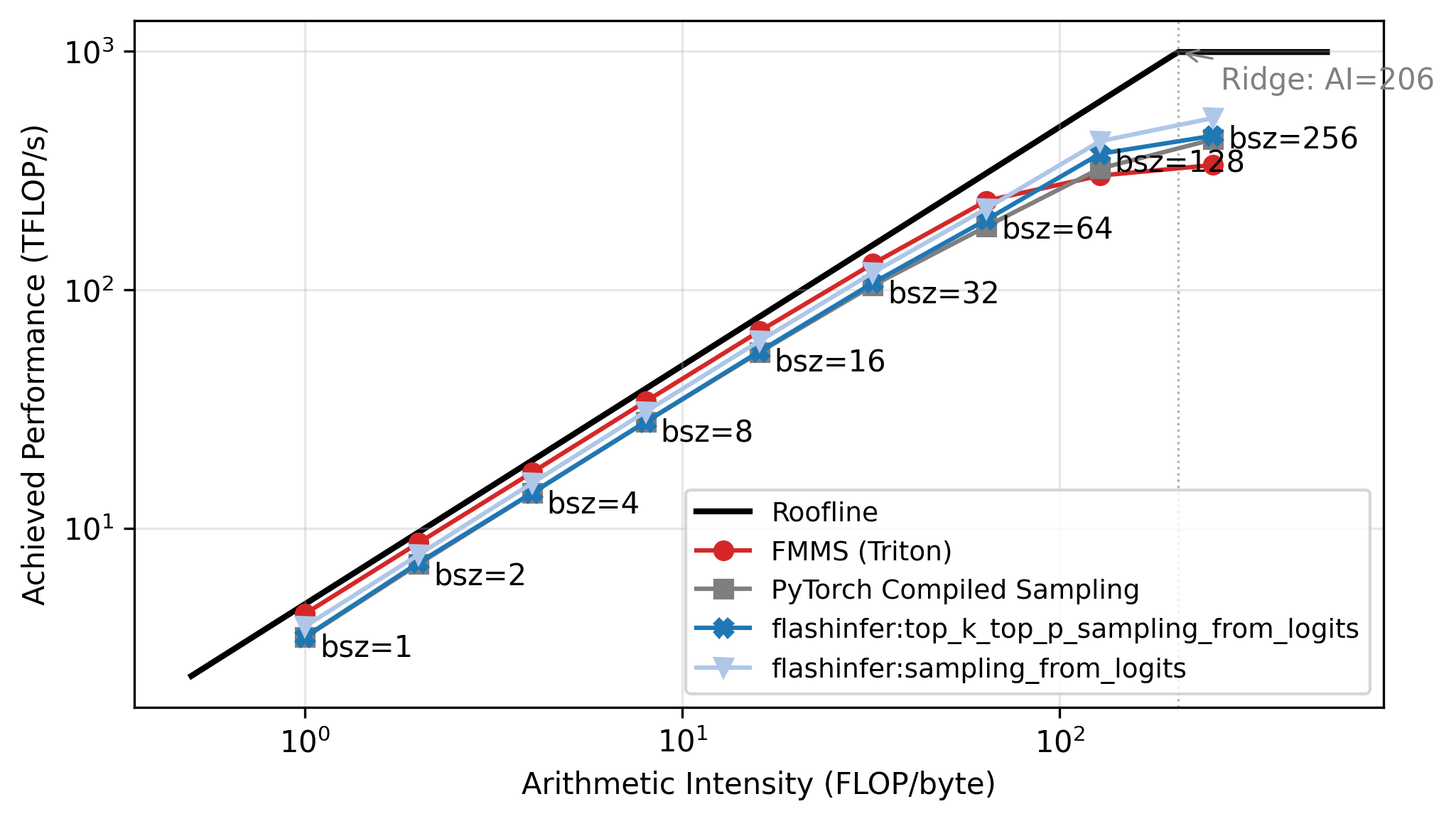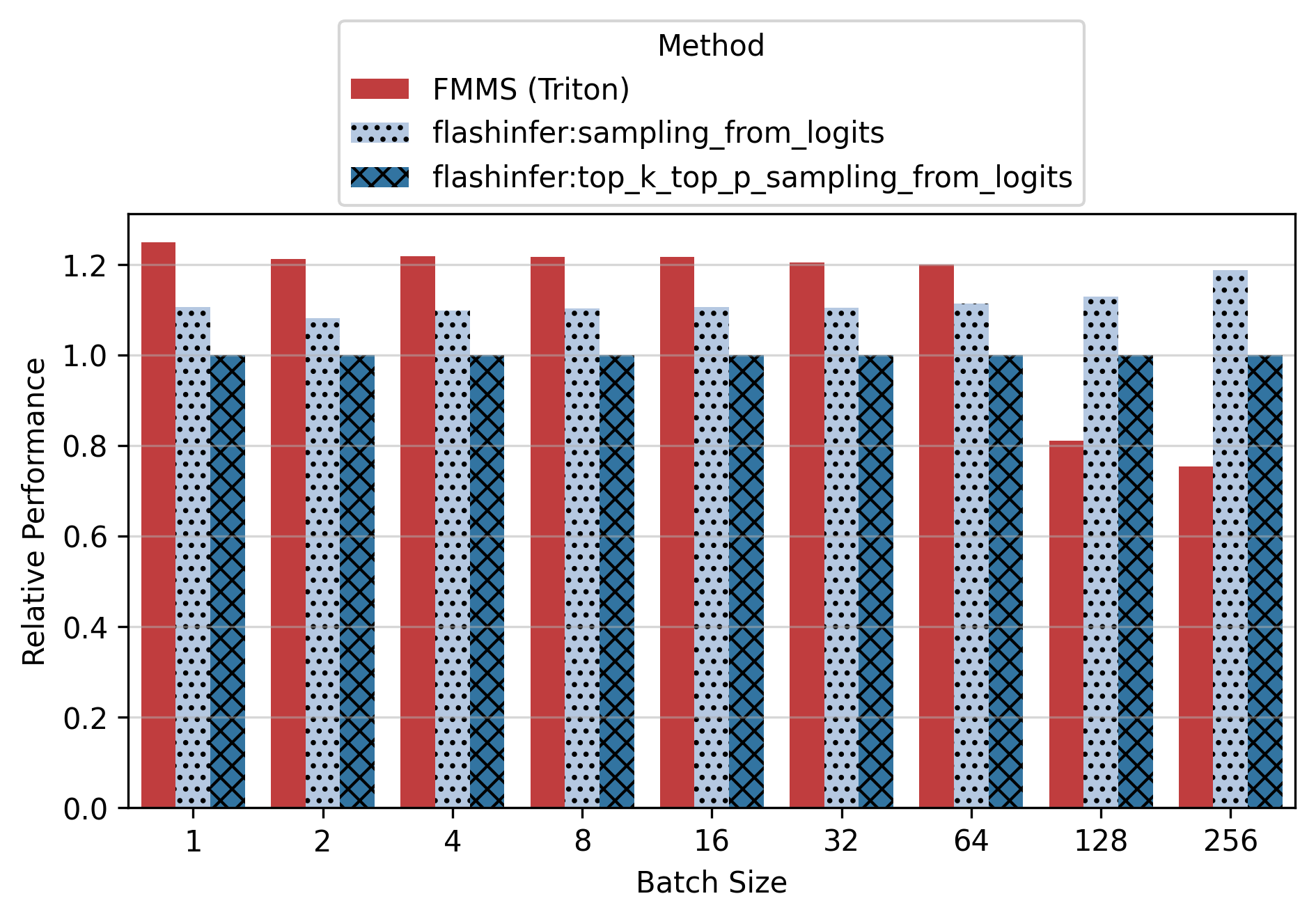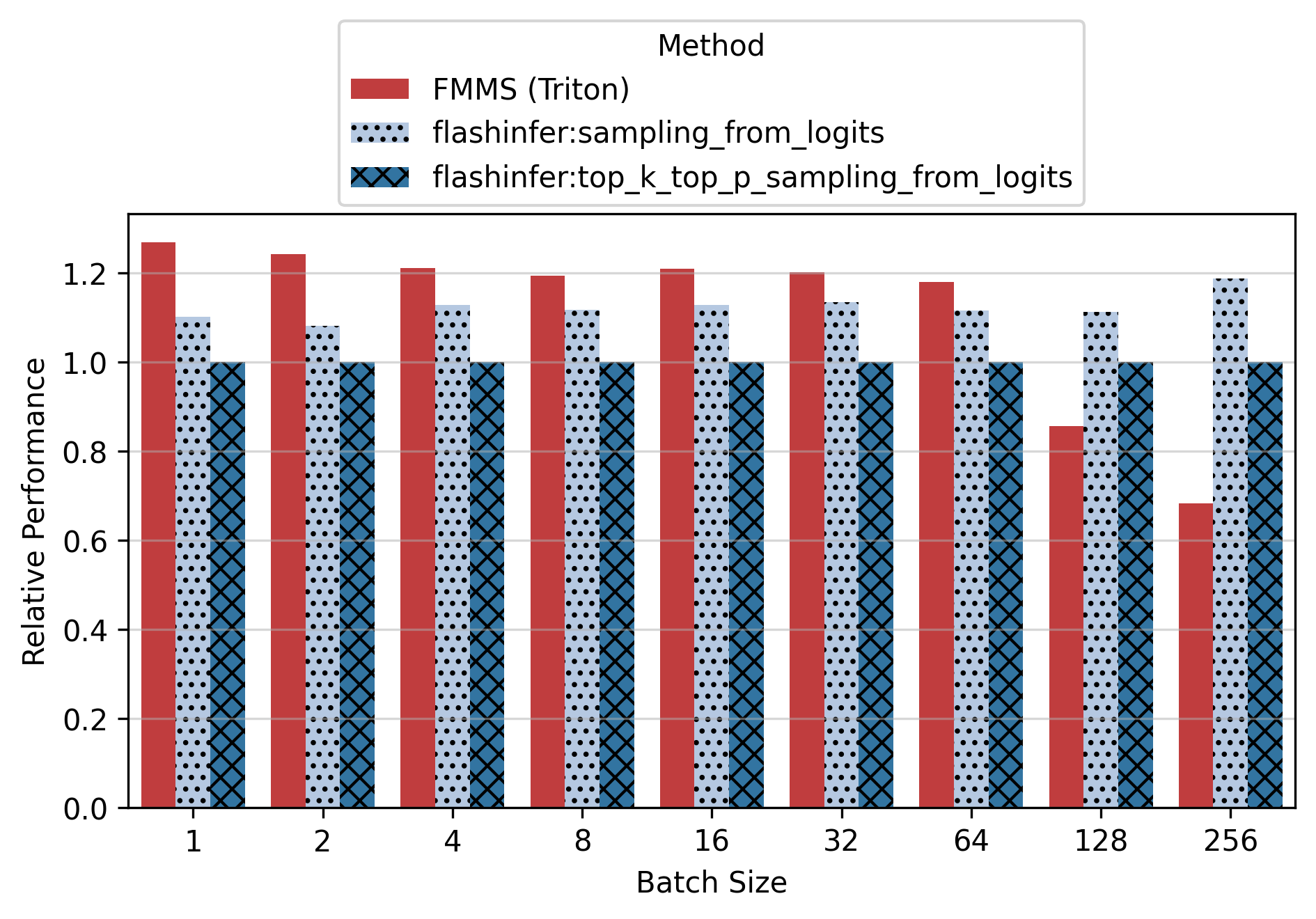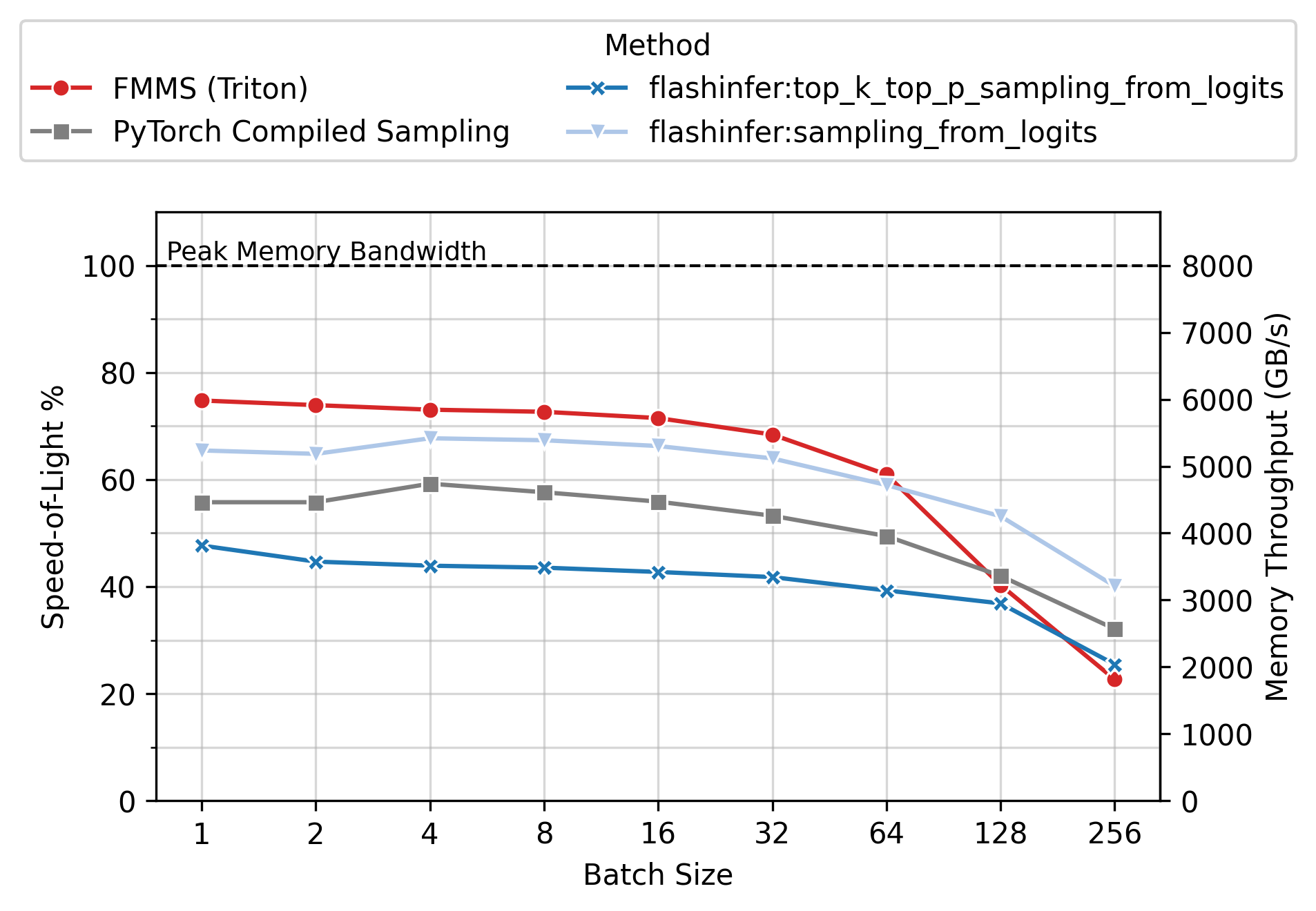 Both FlashInfer kernels require the full logits, so their runtimes include the matmul that computes the logits. This is a fair comparison because FMMS also computes a matmul, the full logits tensor is just not written to GMEM.