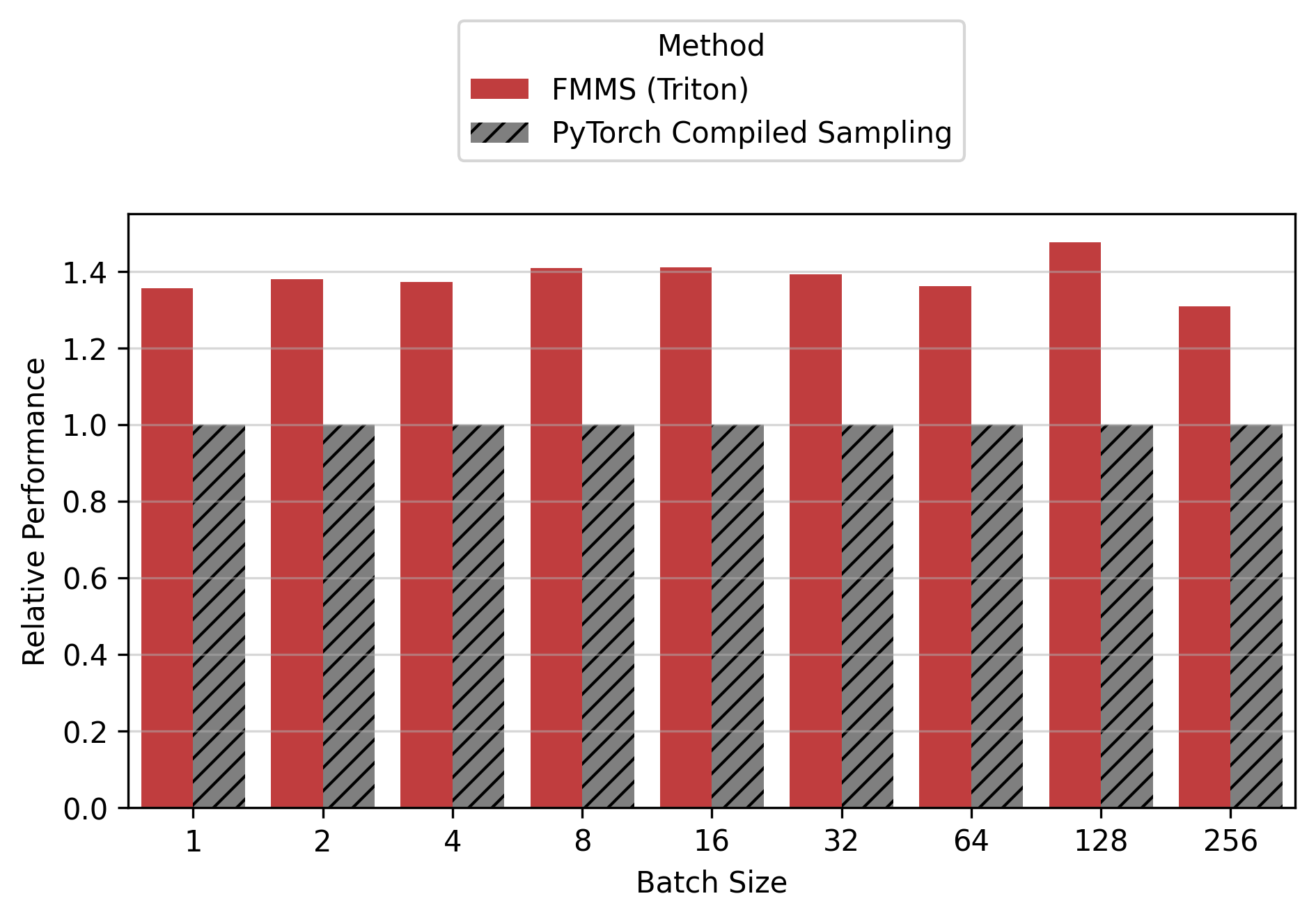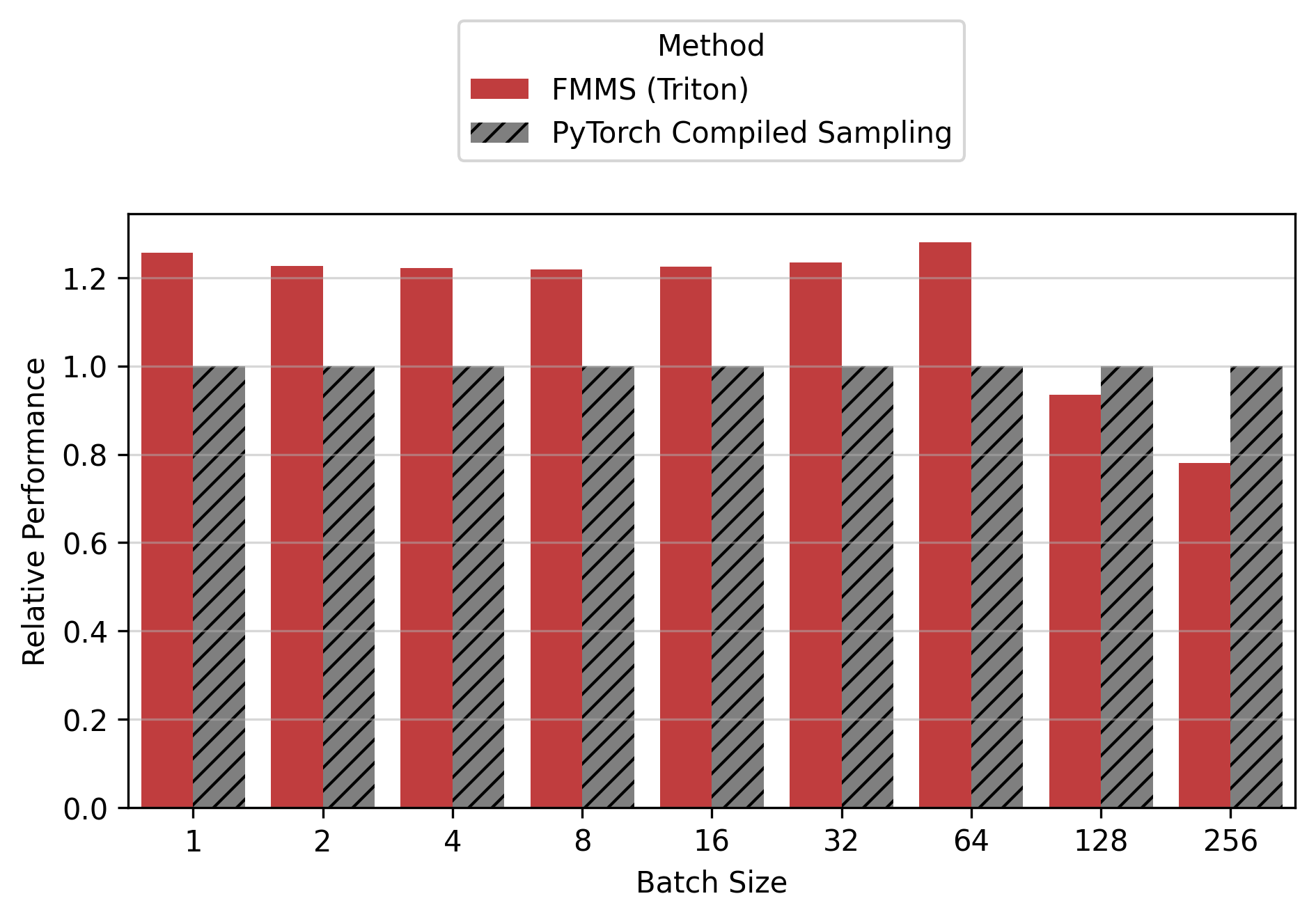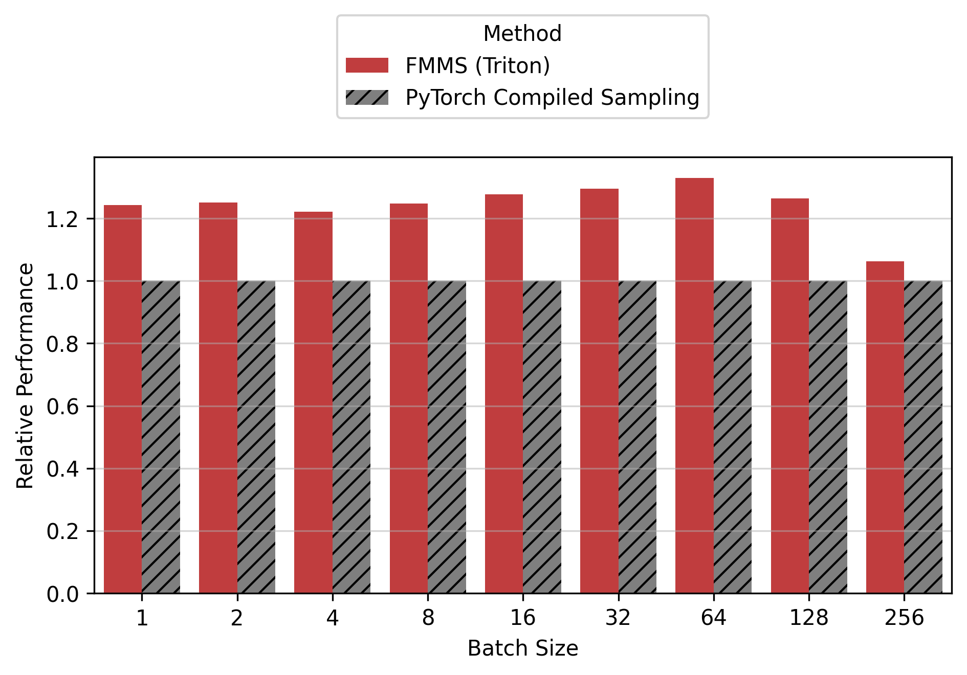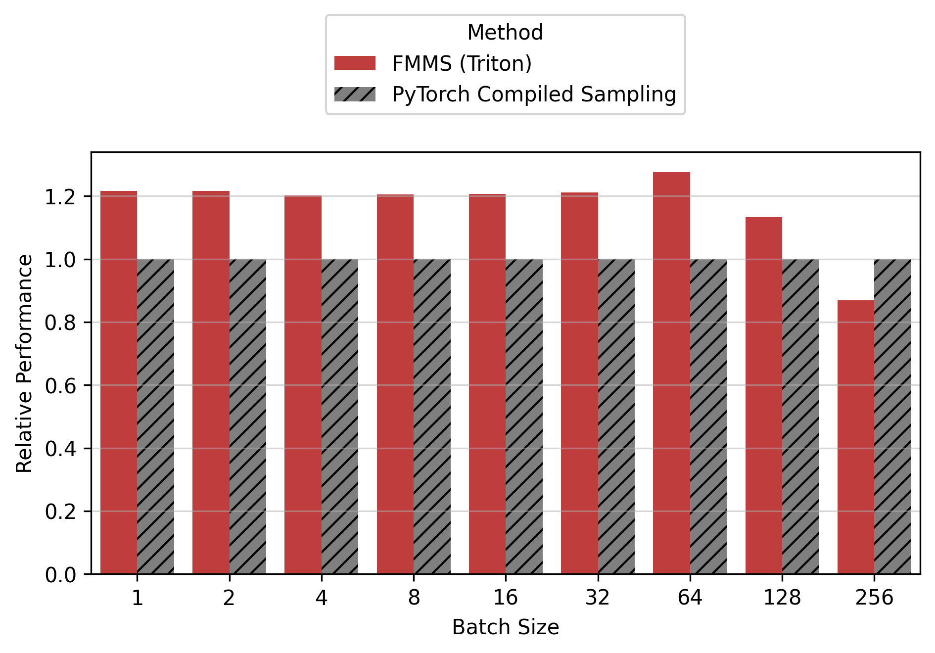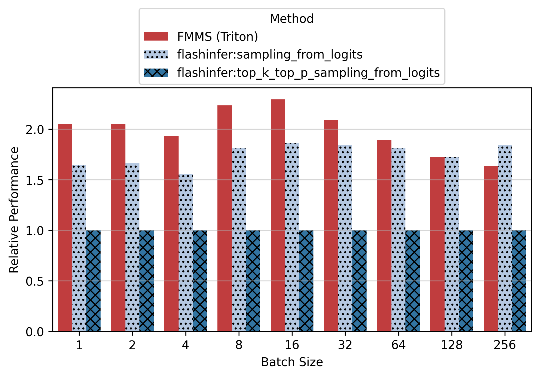 Vs top_k_top_p, FMMS is up to 2.30x faster (B300, small config, N=16). For the small config on B300, FMMS is 1.63-2.30x faster across all batch sizes1.