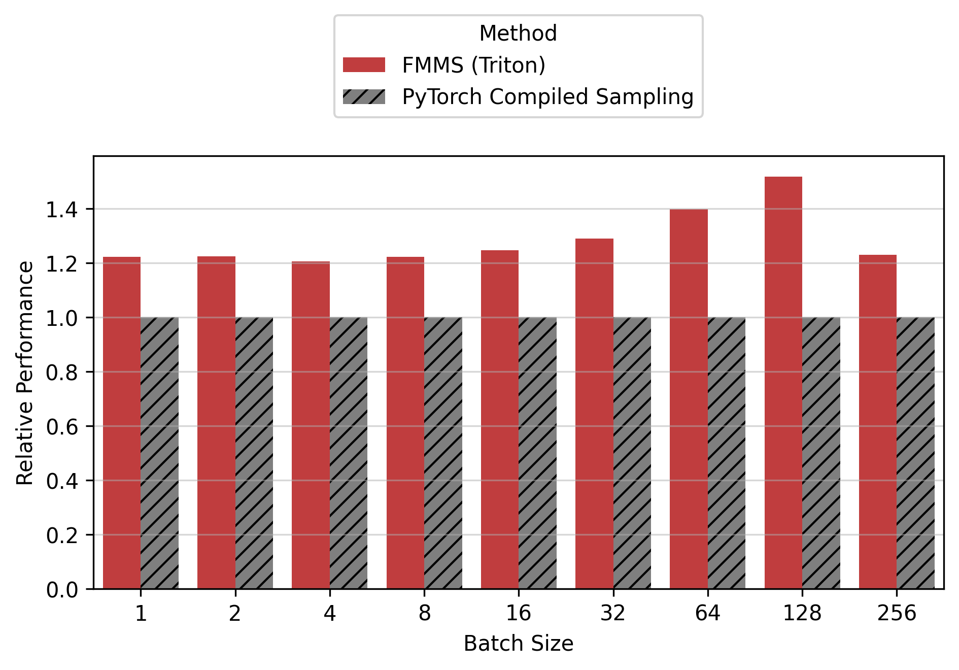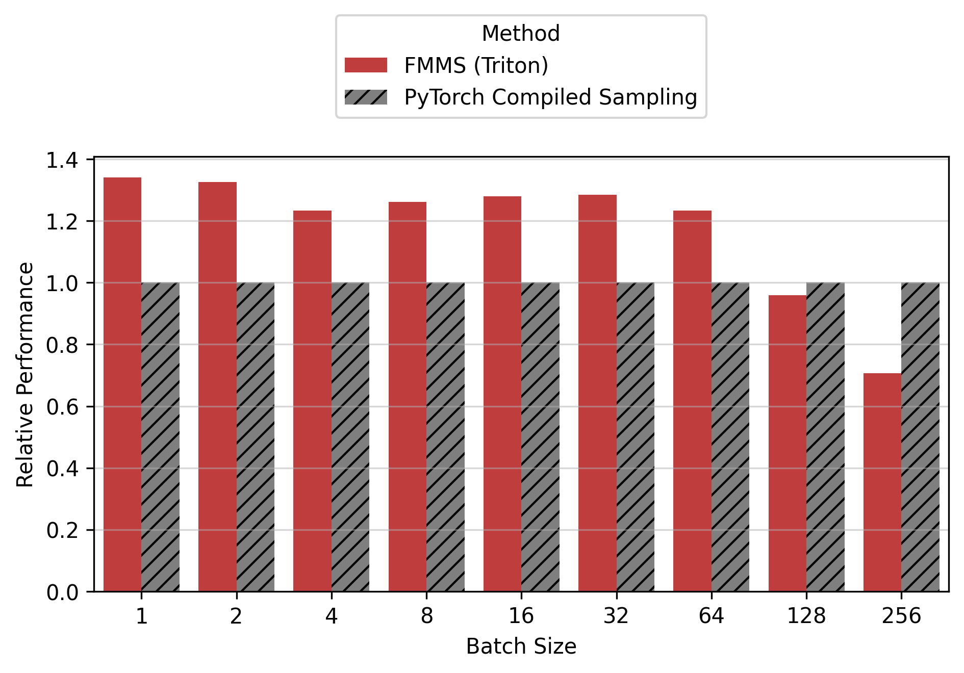The roofline plot in Figure 5 confirms this: all methods track the memory-bound slope up to N=64, then flatten as they approach the compute ceiling. Each point is labeled with its batch size. FMMS sits slightly above the baselines in the memory-bound region because it reads the weight matrix once and writes only two scalars per tile to GMEM, while the baselines write and read back the full logits tensor. At large batch sizes the matmul becomes compute-bound, and the baselines benefit from cuBLAS (via torch.compile), while FMMS implements the matmul in Triton. FMMS also has higher register pressure from fusing Gumbel noise generation into the same kernel.