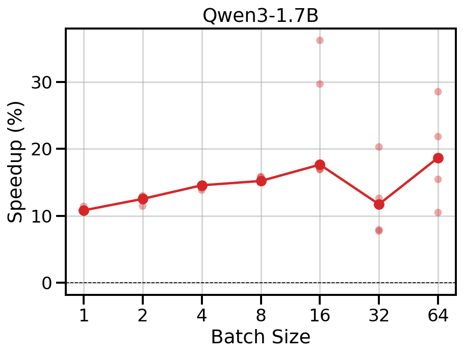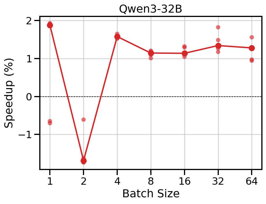 The end-to-end impact depends on how much of the decode step the LM head represents. For small models (Qwen3-1.7B), FMMS reduces TPOT by up to 19%. For large models (gpt-oss-120b, Qwen3-32B), the LM head is a smaller fraction of the total step, so improvements are modest (1-5%). The sweet spot is small-to-medium models served at low-to-moderate concurrency, where the LM head is a significant bottleneck and the matmul stays memory-bound.