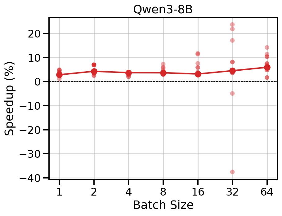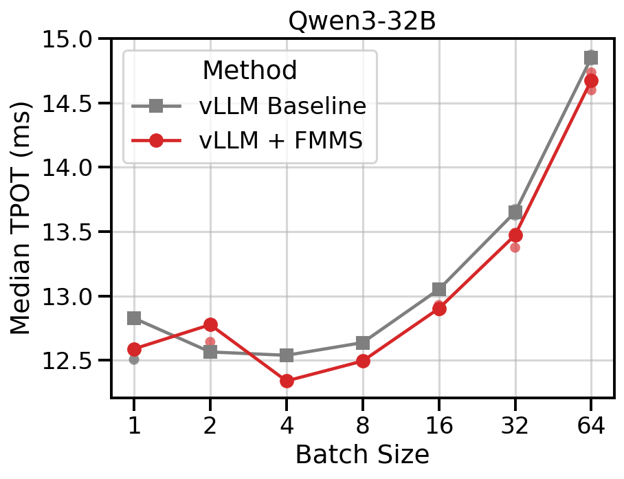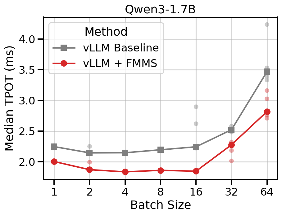 The Qwen3-8B trials show substantial run-to-run variability: at concurrency 32, trial 1 measures a 17% reduction, while trial 2 measures a 4.5% reduction. The absolute runtimes differ by 30%, potentially due to GPU thermal state or other system-level factors. This variability is inherent to end-to-end serving benchmarks, where many system-level factors beyond the kernel itself affect TPOT. Despite this, the direction is consistent: FMMS outperforms the baseline at every concurrency level in both trials.