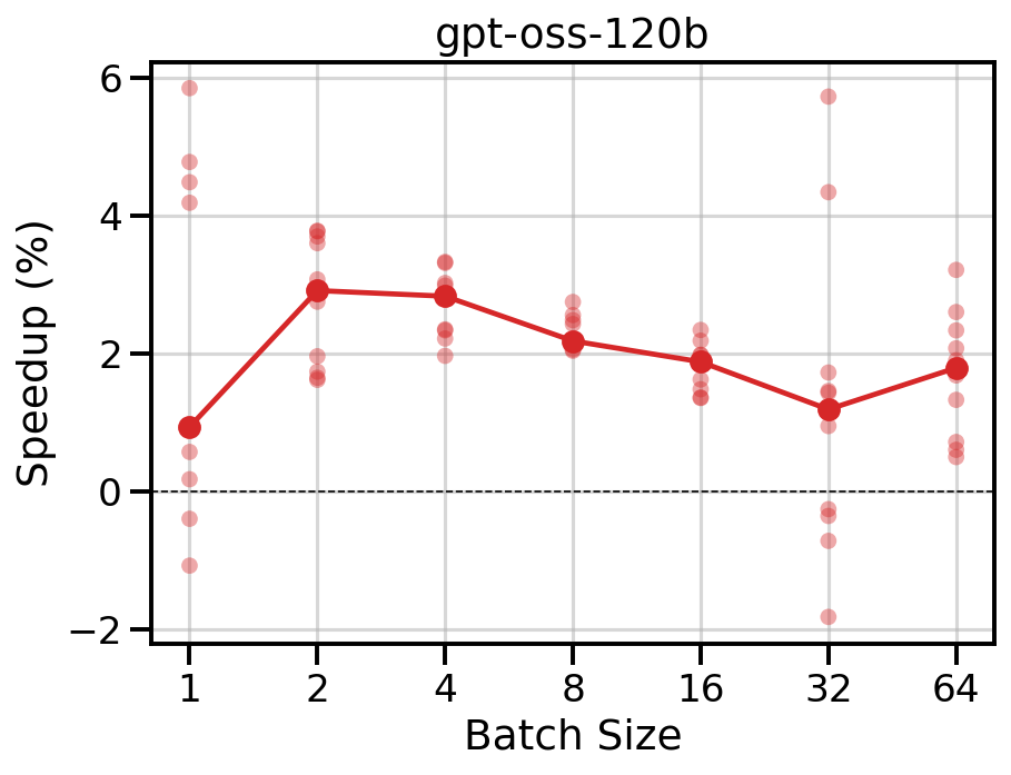 The LM head is a smaller fraction of the total decode step in a 120B-parameter model. FMMS reduces TPOT by up to 5% at low concurrency (1-8), with modest 1-2% improvements at higher concurrency levels.